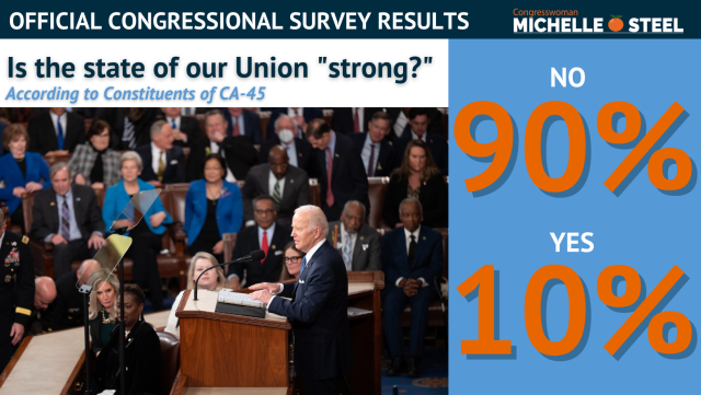 On Tuesday night, President Biden delivered his second State of the Union address, where he assured us that the state of our Union is "strong." My office conducted a survey of constituents in California's 45th District to ask if they feel the same way. Unsurprisingly, 90% said they disagree with the President.